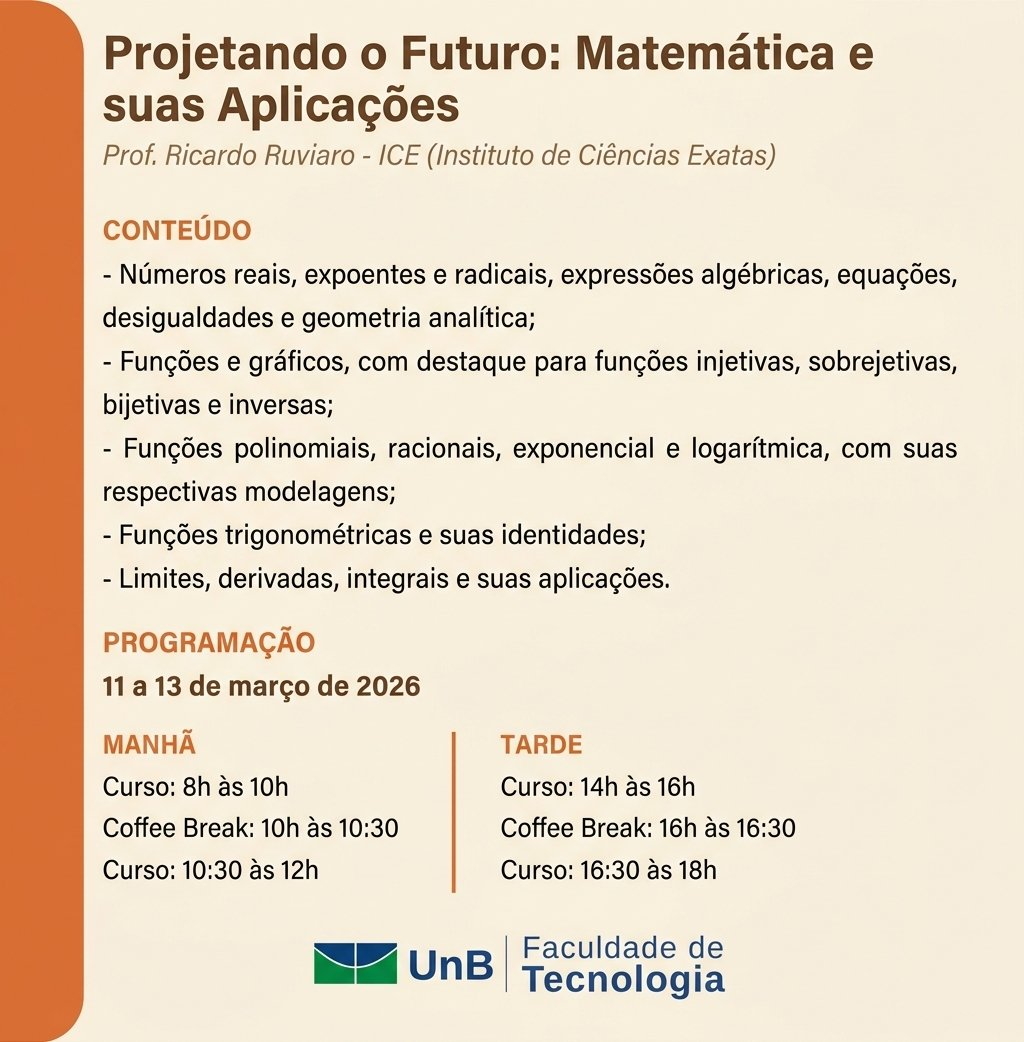 Minicurso para Calouros abre inscrições: "Projetando o Futuro: Matemática e suas Aplicações" Evento gratuito e exclusivo para ingressantes da UnB, que acontecerá entre os dias 11 a 13 de março de 2026, no Auditório Roberto Salmeron, com foco na preparação para as disciplinas de cálculo do primeiro ano. Detalhes Publicado: Quarta, 04 Março 2026 12:35 A Faculdade de Tecnologia da Universidade de Brasília (FT/UnB) promove, entre os dias 11 e 13 de março de 2026, o minicurso "Projetando o Futuro: Matemática e suas Aplicações". As atividades ocorrerão das 8h às 18h no Auditório Roberto Salmeron e são voltadas exclusivamente aos calouros da instituição, sem custo de inscrição. O minicurso tem como objetivo central oferecer aos novos estudantes uma base matemática sólida, indispensável ao acompanhamento das disciplinas de cálculo previstas para o primeiro ano de graduação. A proposta pedagógica articula conceitos teóricos fundamentais a aplicações práticas, favorecendo a compreensão integrada dos conteúdos e o desenvolvimento de competências essenciais à trajetória acadêmica e profissional. Além do aprofundamento em conteúdos matemáticos, o evento representa uma oportunidade de ambientação à vida universitária. A convivência com colegas e docentes em um espaço de aprendizagem colaborativa contribui para que os ingressantes iniciem sua jornada na UnB com maior segurança e senso de pertencimento ao meio acadêmico. As inscrições estão abertas e podem ser realizadas por meio do formulário disponível em: https://forms.office.com/r/UqHVMgXMFy. Cartaz