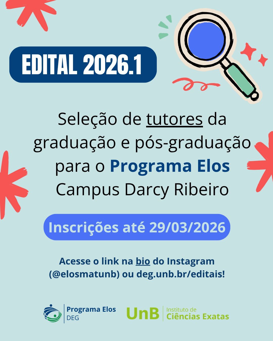 Programa Elos abre seleção para tutores de Cálculo I no Campus Darcy Ribeiro Inscrições para o processo seletivo estão abertas até 29 de março de 2026, com bolsas mensais de até R$ 1.200,00. Detalhes Publicado: Segunda, 23 Março 2026 13:14 O Programa Elos divulgou o Edital Conjunto n.º 25/DEG/IE/2026, destinado à seleção de tutores para a disciplina de Cálculo I no Campus Darcy Ribeiro da Universidade de Brasília. As inscrições estão abertas e seguem até o dia 29 de março de 2026. Os candidatos selecionados receberão bolsa mensal no valor de R$ 700,00, para estudantes de graduação, ou R$ 1.200,00, para pós-graduandos. O edital completo, com requisitos, cronograma e demais informações, está disponível em www.deg.unb.br/editais. Cartaz: